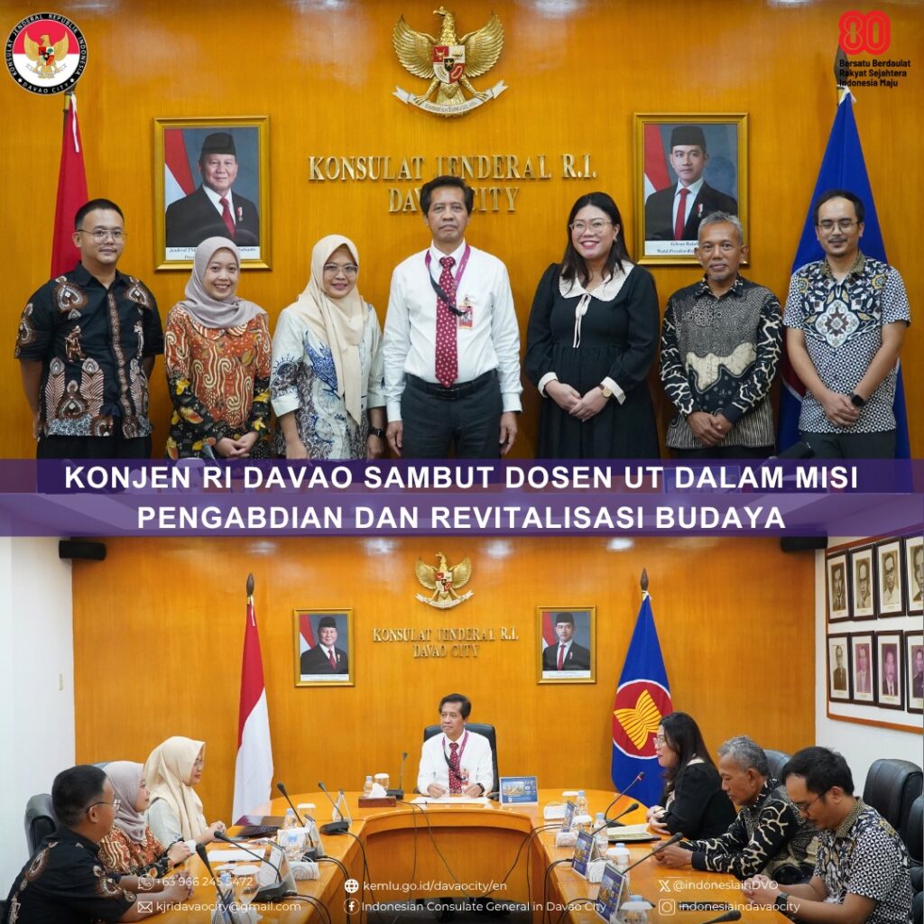 Konsul Jenderal RI Davao City menerima Courtesy Call dari dua dosen Sekolah Pascasarjana Universitas Terbuka (UT) yang akan melaksanakan kegiatan Pengabdian kepada Masyarakat (PkM) Internasional bertema βPenguatan Psikososial Pendidikan dan Revitalisasi Budaya Keturunan Indonesia di Kota Davaoβ yang diadakan di Ruang Rapat pada 28 Oktober 2025.